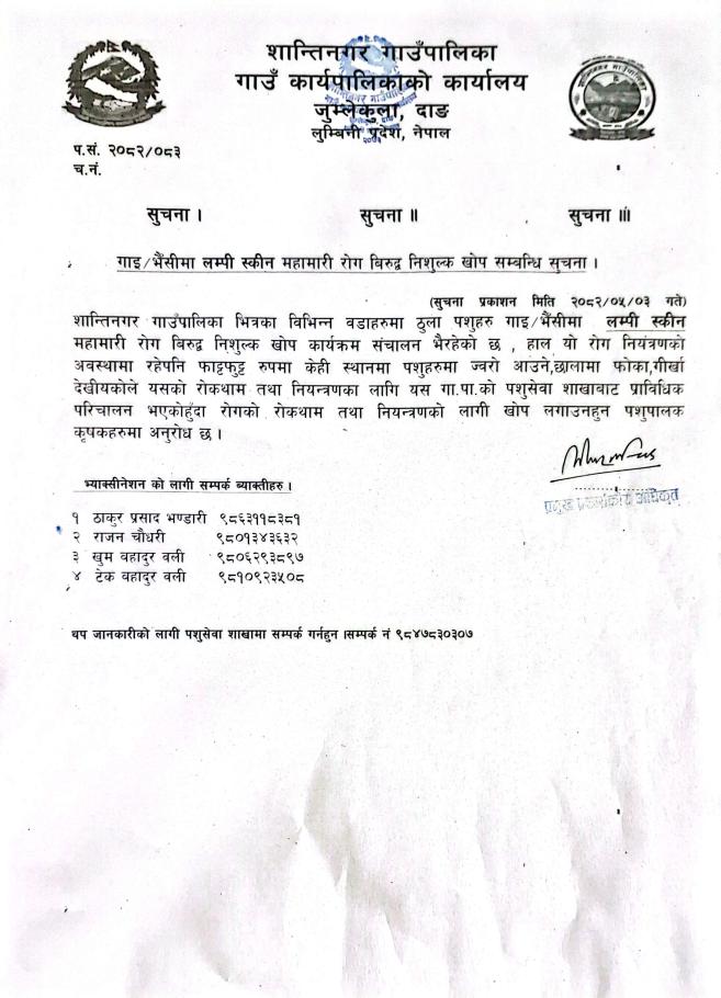 » गाई/भैँसीमा लम्पी स्कीन महामारी रोग विरुद्ध निशुल्क खोप सम्बन्धी सूचना।