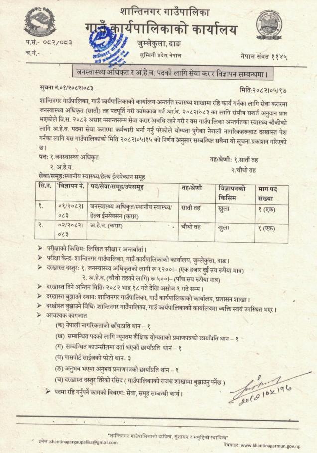 जनस्वास्थ्य अधिकृत र अ.हे.व. पदको लागि सेवा करार विज्ञापन सम्बन्धमा ।