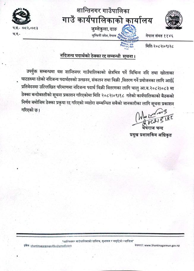 नदिजन्य पदार्थको ठेक्का रद्द सम्बन्धी सूचना ।।