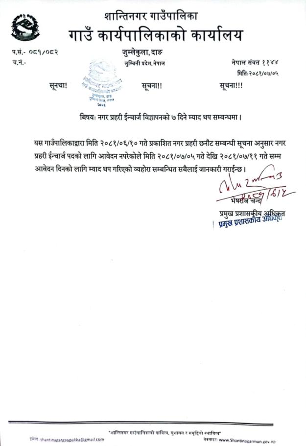 नगर प्रहरी ईन्चार्ज विज्ञापनको ७ दिने म्याद थप सम्बन्धमा ।।