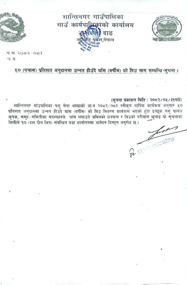 ५० प्रतिशत अनुदानमा उन्नत हिँउदे घाँस को विउ माग सम्बन्धि सूचना ।