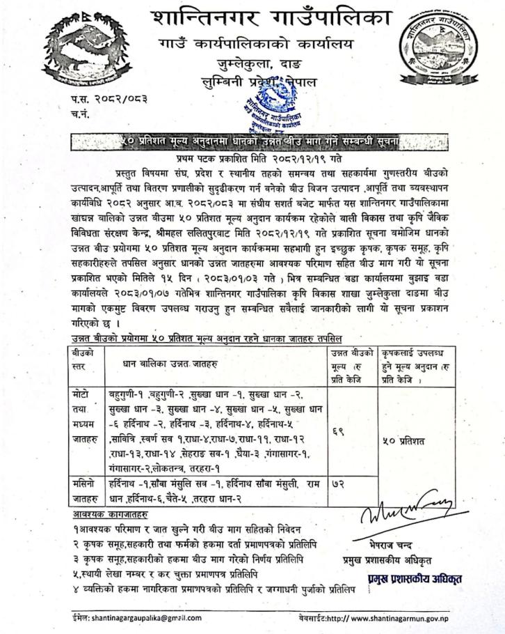 ५० प्रतिसन मुल्य अनुदानमा धानको उन्नत वीउ माग गर्ने सम्बन्धी सूचना ।।